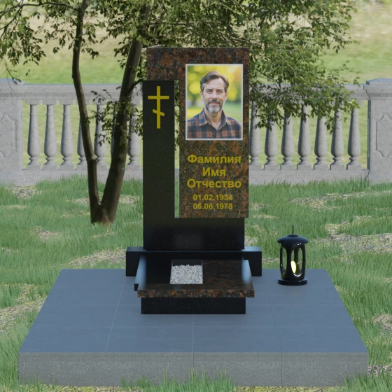 На боковом пилоне расположен каноничный православный крест. Его исполнение отличается благородной простотой — это лаконичный трехсоставный символ веры, который не перегружает композицию, но расставляет необходимые духовные акценты. Благоустройство участка продумано до мелочей: стела установлена на широкий полированный цоколь, а место захоронения полностью закрыто сплошной надгробной плитой. Такое решение не только придает ансамблю вид законченного монолита, но и обеспечивает практичность, избавляя от необходимости сложного ухода за почвой.