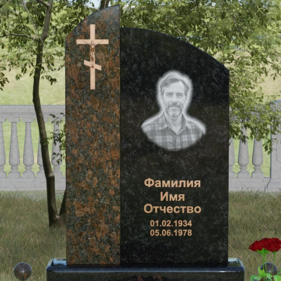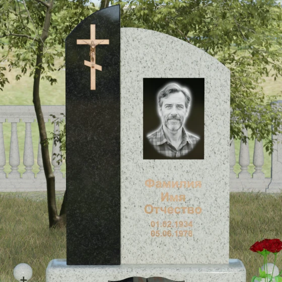 Данное ритуальное изделие представляет собой выразительную художественную композицию, построенную на гармонии двух различных фактур и форм. Выбор этой модели обусловлен её глубоким символизмом: асимметричное разделение стелы на две части олицетворяет земной и небесный пути. Левая часть, выполненная в виде строгого вертикального столпа из насыщенного цветного гранита, служит основанием для объемного православного креста с детально проработанным распятием. Правая же часть, имеющая мягкий, плавный изгиб верхней грани в форме волны, создает идеальное пространство для размещения портрета и памятных слов. Сочетание строгой геометрии и лиричного изгиба позволяет выразить всю многогранность чувств — от глубокой скорби до светлой памяти.