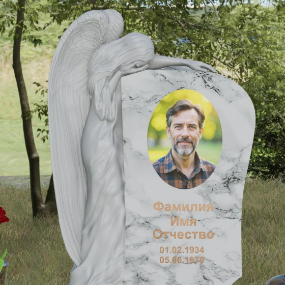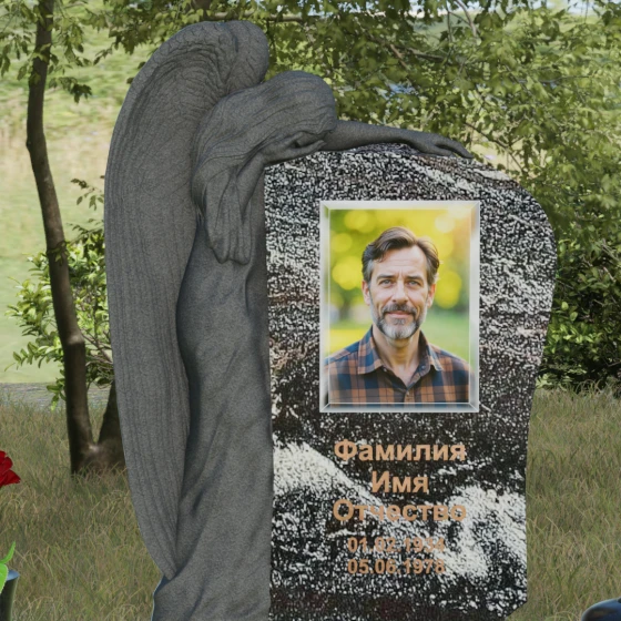 Центральным художественным элементом композиции является искусная скульптура скорбящего ангела, выполненная в технике глубокого барельефа. Фигура небесного защитника органично интегрирована в левую часть каменного полотна. Мы видим детальную проработку каждого перышка на опущенных крыльях, мягкие, ниспадающие складки плащаницы и кроткий изгиб шеи — ангел склонил голову в знак вечного сострадания. Особого внимания заслуживает игра фактур: матовая, бархатистая поверхность резной фигуры контрастирует с безупречным зеркальным блеском основной плоскости, на которой располагается портрет и эпитафия. Такая полировка создает эффект глубокого черного или цветного зеркала, в котором отражается небо, символизируя связь между земным и небесным.
