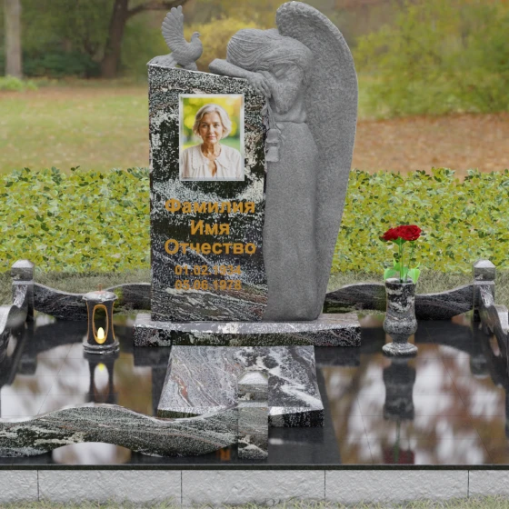 Верхний контур монумента украшен реалистичной фигуркой голубя, символизирующего чистоту души и мир. Композиция выстроена на игре фактур: идеально гладкий, иссиня-черный гранит отражает окружающий мир, в то время как резные элементы имеют благородную шероховатость, подчеркивающую природную суть материала. Форма стелы асимметрична, что придает всему комплексу динамику и современный вид в стиле модерн, сохраняя при этом торжественную монументальность.