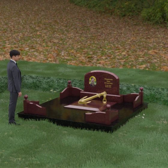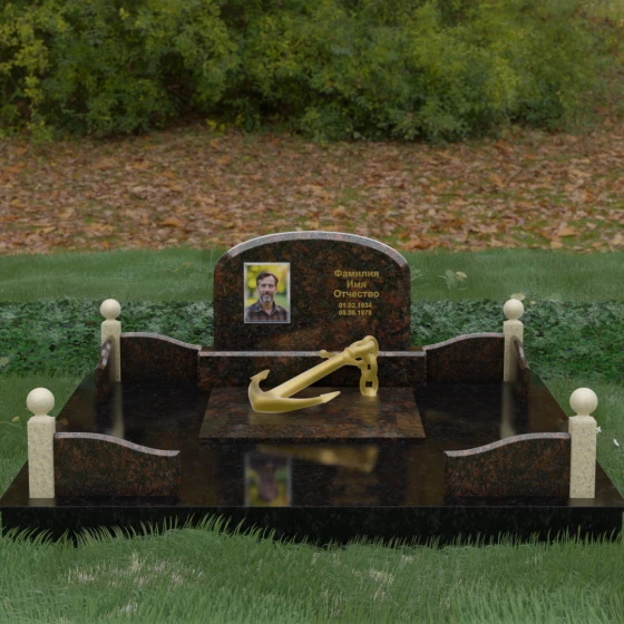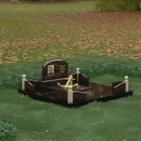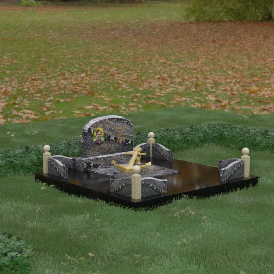 • Центральный символ: На надгробной плите расположен объемный декоративный элемент в виде золотого якоря с массивной цепью. Этот символ олицетворяет надежду, твердость характера и профессиональный путь, связанный со стихией, становясь смысловым центром всего мемориала.