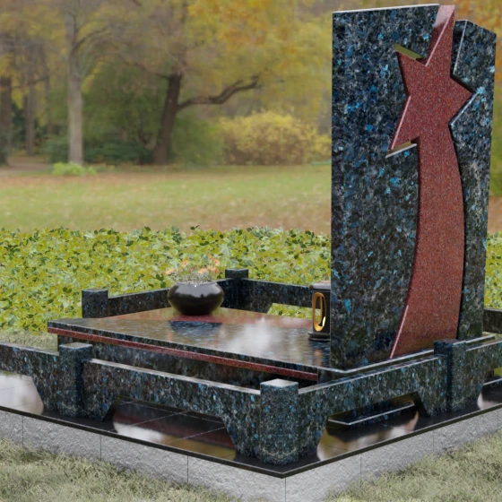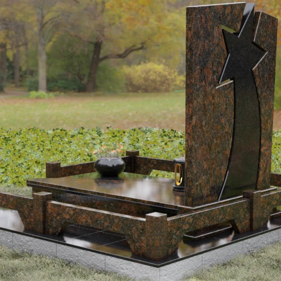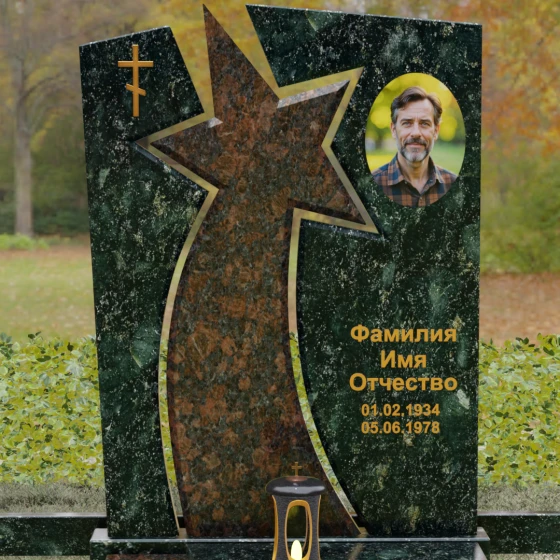 Форма этого мемориала наполнена глубокими смыслами. Центральный символ — звезда — традиционно олицетворяет путеводный свет, высокие достижения и бессмертие души. Для тех, чья жизнь была связана со служением отечеству, этот элемент подчеркивает их доблесть и профессиональный путь. В сочетании с православным крестом композиция говорит о единстве земного подвига и духовного упокоения. Плавные, дугообразные линии, обрамляющие центральную вставку, символизируют непрерывность времени и защиту, которую обретает душа в вечности. Асимметричная верхушка стелы подчеркивает индивидуальность и неповторимость жизненного пути человека.