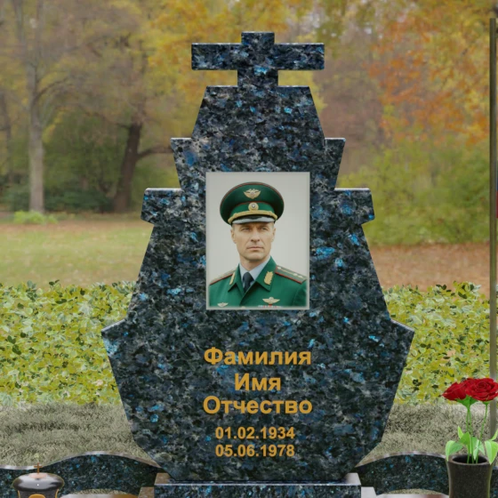 Данное ритуальное изделие приковывает взгляд своей необычной, глубоко символичной архитектурой. Силуэт стелы представляет собой сложную многоступенчатую композицию, которая плавно сужается кверху, напоминая очертания величественной часовни или лестницы, уходящей в небеса. Каждый ярус боковых граней выполнен с идеальной геометрической точностью: резкие, строгие выступы создают ритмичный рисунок, который подчеркивает статус и твердость характера усопшего. Венчает композицию лаконичный четырехконечный крест, который не просто закреплен сверху, а является монолитным продолжением самого камня, что символизирует неразрывную связь души с вечностью.