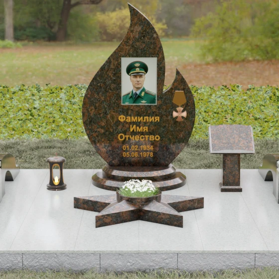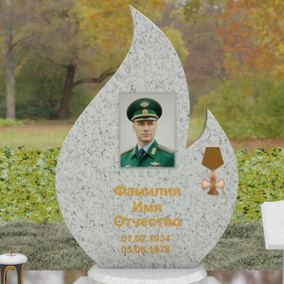 Центральное мемориальное изделие выполнено в уникальной форме застывшего пламени, которое стремится ввысь, символизируя неугасаемую энергию жизни. Плавные, текучие изгибы боковых граней переходят в изящное заостренное навершие, создавая динамичный и одновременно строгий силуэт. Особое внимание стоит уделить обработке камня: по всему периметру лицевой грани снята широкая фаска, которая благодаря безупречной зеркальной полировке создает великолепную игру света и тени, подчеркивая объем и скульптурность формы.