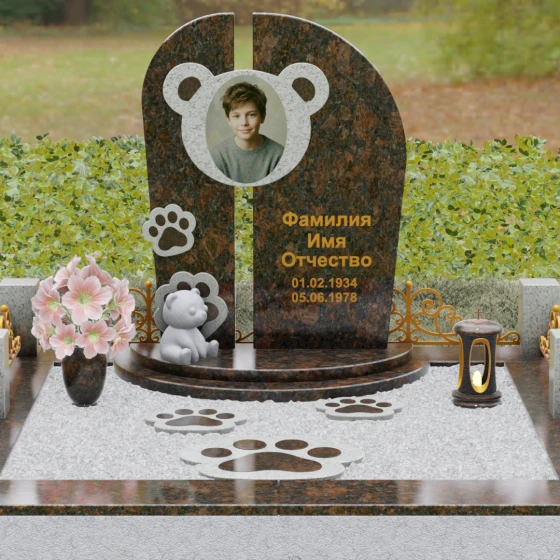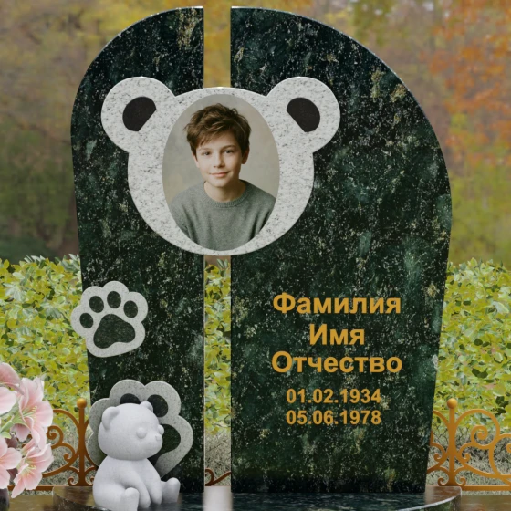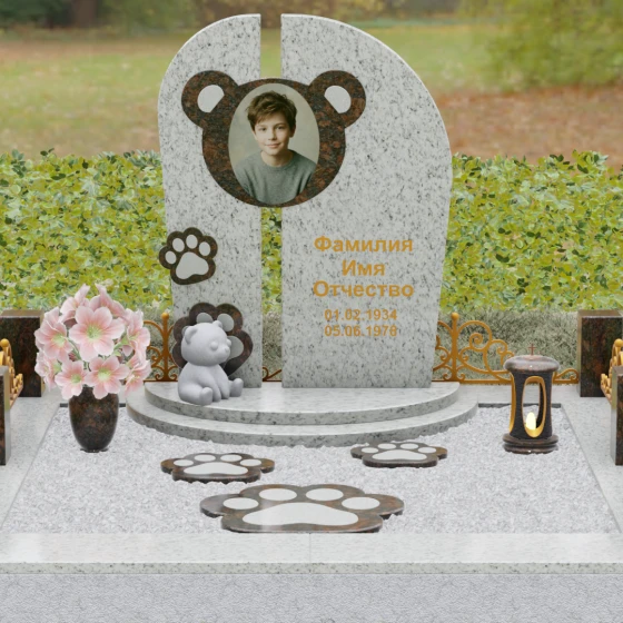 Композиция данного мемориала поражает своей уникальной архитектурой. Центральное вертикальное полотно разделено на две симметричные части узким вертикальным просветом, что создает ощущение легкости и устремленности ввысь, несмотря на внушительный вес камня. Главным художественным акцентом является медальон в верхней части, выполненный в виде стилизованной головы медвежонка. Портрет обрамлен светлой вставкой из благородного гранита, которая выступает над основной плоскостью, создавая эффект мягкого свечения вокруг лика.