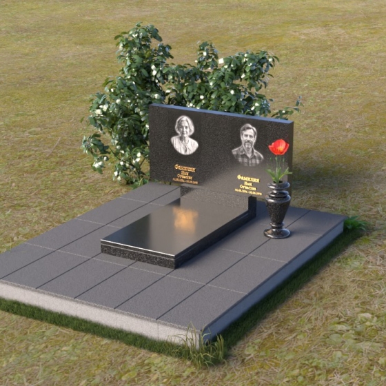 Представленный памятник (артикул ПГ001) являет собой образец строгости и лаконичности, где каждая деталь подчинена общей концепции увековечивания памяти. Композиция состоит из основания, облицованного серыми плитами, горизонтальной плиты, и вертикальной плиты с портретами. Дополнительно предусмотрена тумба для вазы.