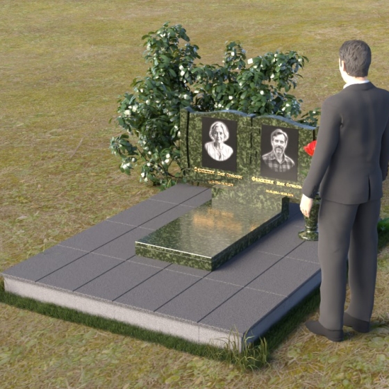 Ритуальное изделие ПГ036 представляет собой сдержанную, но исполненную достоинства композицию, созданную для сохранения памяти о близких. Два прямоугольных элемента стелы, соединенные вместе, образуют волнистый верх, напоминающий раскрытую книгу судеб. Грани обеих частей искусно обработаны, создавая мягкий, обтекаемый силуэт. Зеркальная полировка черного гранита служит идеальным фоном для гравировки портретов и надписей, словно запечатлевая светлые воспоминания в вечном камне. Слева и справа, в верхней части стелы, вырезаны лаконичные кресты, символизирующие веру и надежду. Тонкие линии врезаются в полированную поверхность, создавая игру света и тени, и добавляя глубину изображению. Горизонтальная плита, расположенная перед стелой, выполнена из того же черного гранита с зеркальной полировкой, отражая небо и окружающий пейзаж, создавая ощущение легкости и воздушности. Вместе с тем, основание памятника выполнено из серого камня, что придает всей композиции устойчивость и основательность.