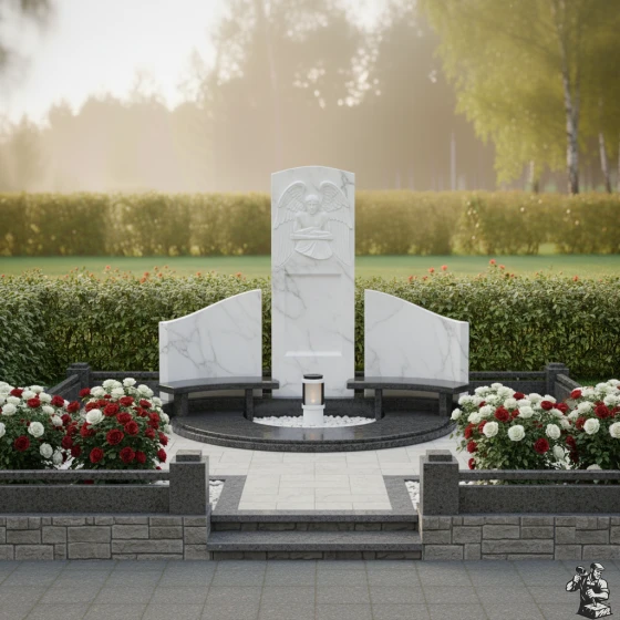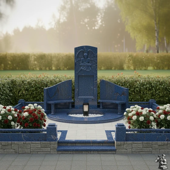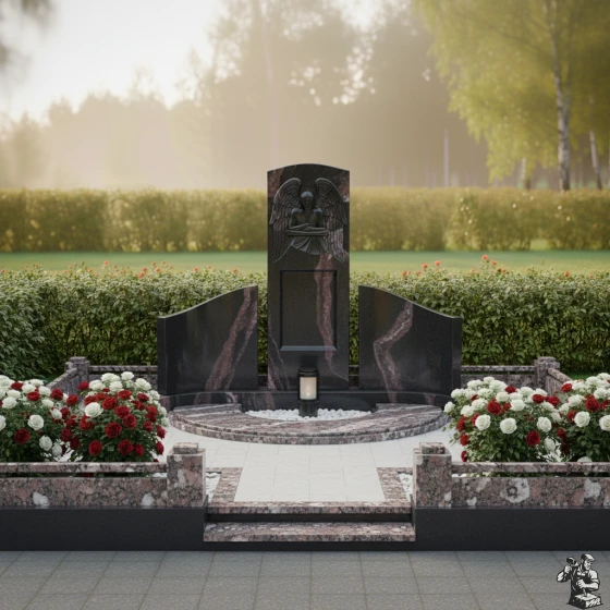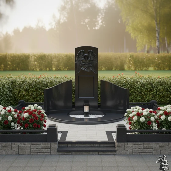 По обе стороны от центральной стелы расположены две полукруглые, словно обнимающие ее, боковые плиты. Их плавная, изогнутая форма создает ощущение защищенности и уюта, формируя единое, замкнутое пространство. Эти боковые элементы также имеют безупречную зеркальную полировку, что позволяет им отражать окружающий свет и создавать визуальную глубину. Основание мемориальной композиции выполнено в виде полукруглой надгробной плиты, которая не только придает конструкции законченный и монументальный вид, но и значительно упрощает уход за местом упокоения. В центре этой плиты, в небольшом углублении, предусмотрено место для лампады или небольшой вазы, что позволяет добавить к композиции элементы живого огня или цветов, символизирующих неугасаемую память.