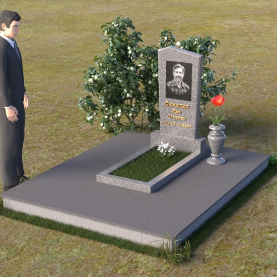 Этот гранитный монумент представляет собой композицию из двух основных элементов: вертикальной плиты с портретом и горизонтальной накладки. Вертикальная плита, возвышающаяся над землей, имеет строгую прямоугольную форму с небольшим скосом в верхней части. Это придает монументу сдержанную элегантность. Зеркальная полировка поверхности отражает свет, создавая ощущение глубины и сияния. На плите выгравирован портрет усопшего, выполненный с высокой точностью и вниманием к деталям. Ниже портрета располагается надпись с именем и датами жизни, выполненная золотым шрифтом. Горизонтальная накладка, расположенная в нижней части, также выполнена из черного полированного гранита и служит своеобразным пьедесталом для вертикальной плиты. Ее гладкая поверхность создает дополнительный контраст с окружающей средой. Рядом с монументом установлена ваза из черного гранита, предназначенная для живых цветов.