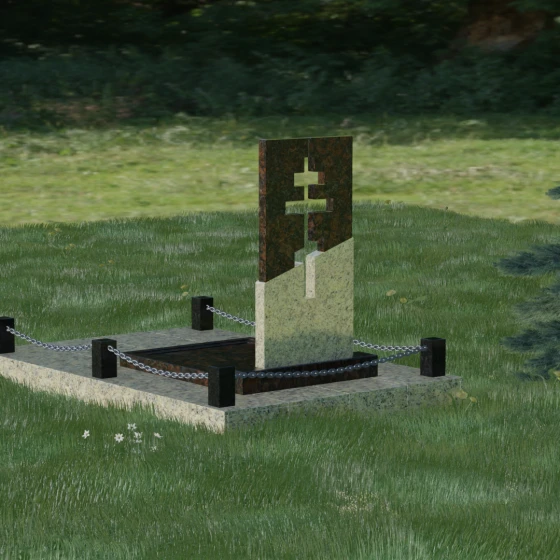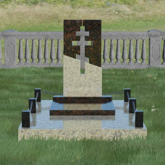 Данная модель — это торжество современной архитектуры и глубокого сакрального смысла. В центре композиции находится величественная стела, состоящая из двух контрастных блоков, разделенных динамичной диагональной линией. Этот художественный прием символизирует границу между земным и вечным, светом и тенью. Главной особенностью изделия является филигранная сквозная резьба: в самом сердце камня вырезан православный восьмиконечный крест. Лаконичность форм подчеркивает строгость и достоинство, а отсутствие лишнего декора позволяет сфокусироваться на главном символе веры.