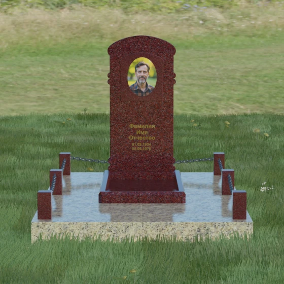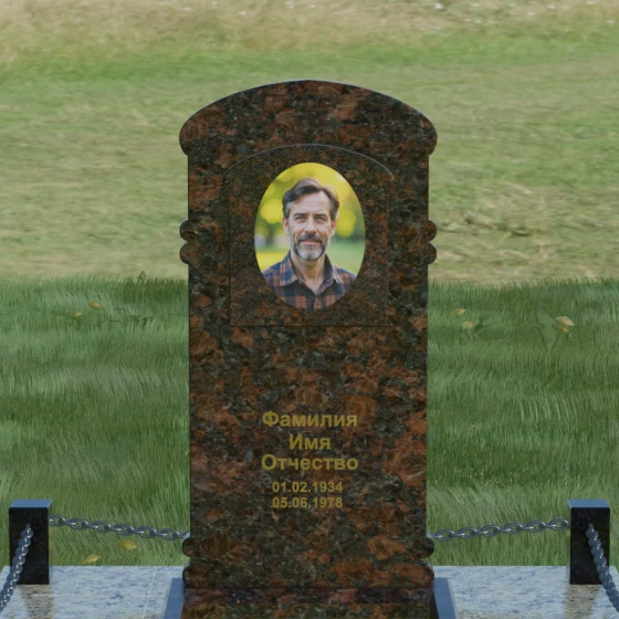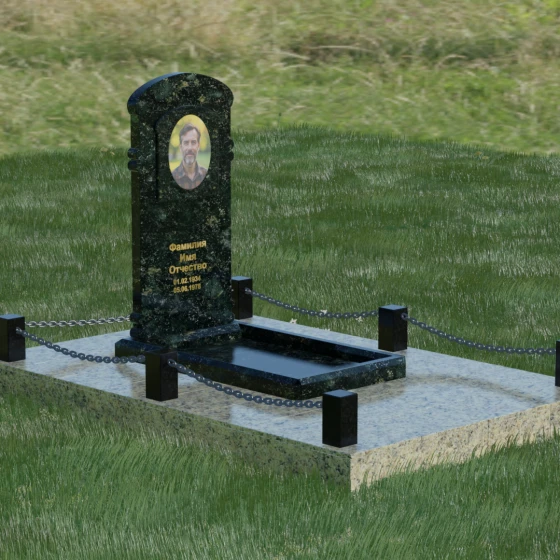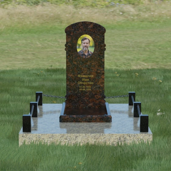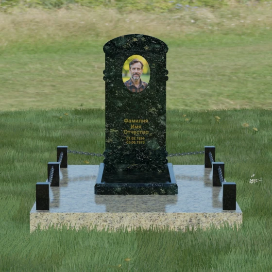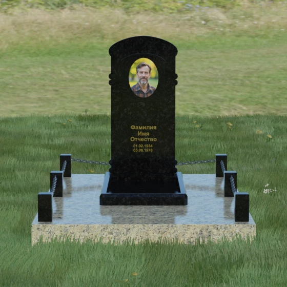 Представленная мемориальная композиция — это воплощение архитектурного баланса, где строгость классических форм встречается с мягкостью художественных линий. В центре ансамбля находится вертикальная стела с уникальной геометрией: её верхняя грань образует пологую, торжественную арку, которая плавно переходит в декоративные выступы на боковых гранях. Особенностью модели является глубокая резная ниша в форме идеального овала, создающая естественное обрамление для портрета. Внутренняя дуга, вырезанная в теле камня над портретной зоной, имитирует свод священной арки, придавая изделию объем и глубину. Зеркальная полировка основной плоскости создает глубокий, почти мистический блеск, в котором отражается небо, подчеркивая монументальность и чистоту исполнения каждой детали.