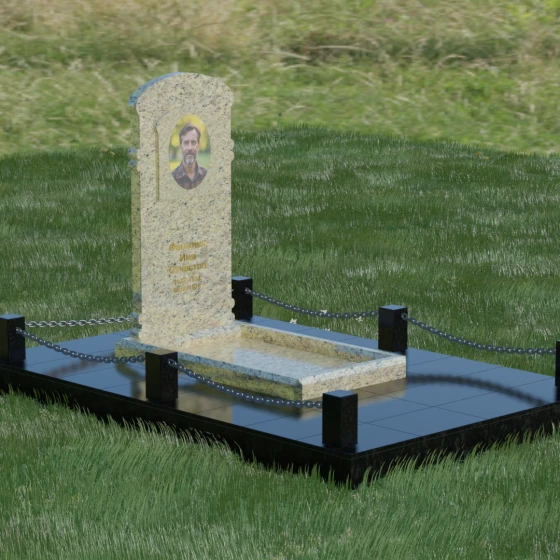 Благоустройство участка продумано до мелочей и формирует законченное сакральное пространство. Основание мемориала установлено на массивный гранитный цоколь, который служит надежным фундаментом и защищает конструкцию от сезонных изменений почвы. Территория полностью облицована широкоформатными полированными плитами — такое решение не только придает эстетическую завершенность, но и гарантирует безупречный вид участка на десятилетия, сводя уход за ним к минимуму. По периметру установлены строгие квадратные столбики из камня, соединенные декоративными цепями. Эта деталь визуально очерчивает границы личного пространства, создавая атмосферу уединения и покоя, отделяя место памяти от остального мира.