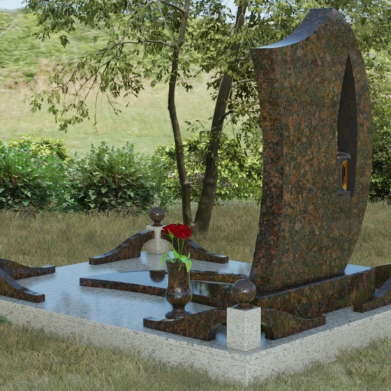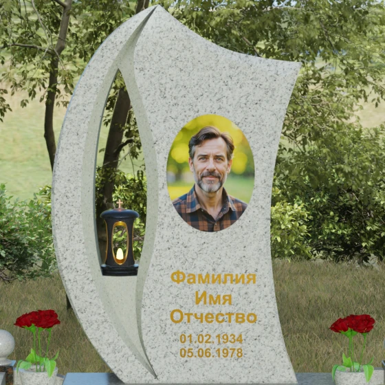 Данная модель выделяется среди классических решений своей сложной, асимметричной формой и глубоким символизмом. Основной вертикальный элемент выполнен в виде плавного изгиба, напоминающего застывшее пламя или морскую волну, что придает всей композиции динамику и в то же время спокойствие. Главной художественной деталью является сквозное каплевидное отверстие в левой части мемориала. Этот «световой проем» служит местом для установки ритуальной лампады, защищенной от ветра, что создает эффект живого, неугасающего огня памяти. Игра контрастов между зеркально отполированной лицевой поверхностью и матовыми, фактурными фасками на внутренних гранях выреза подчеркивает объем и благородство природного камня.