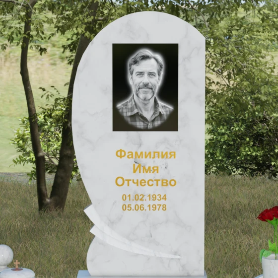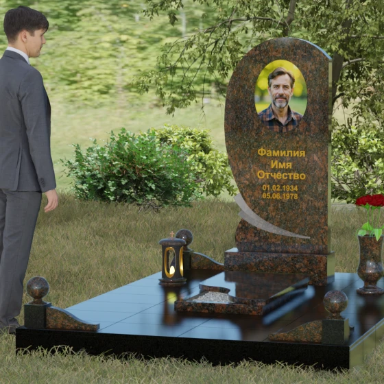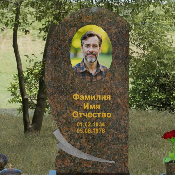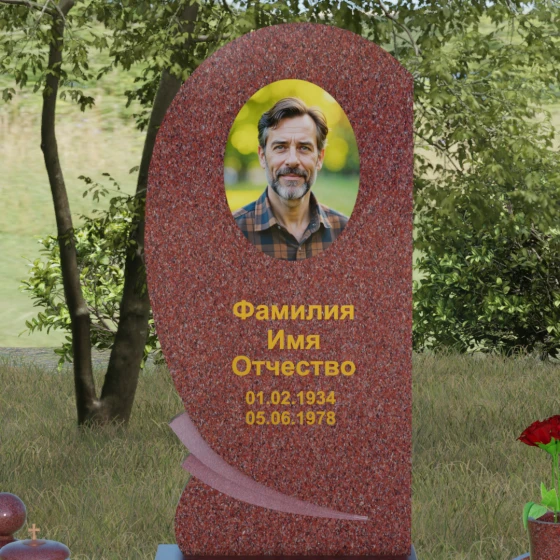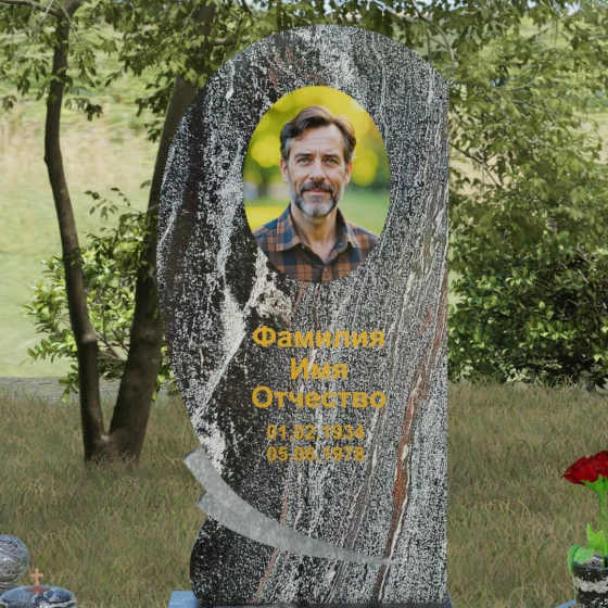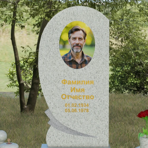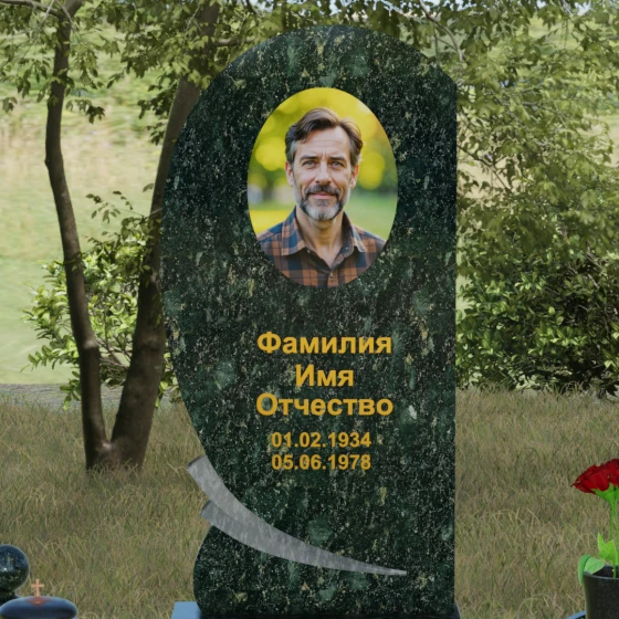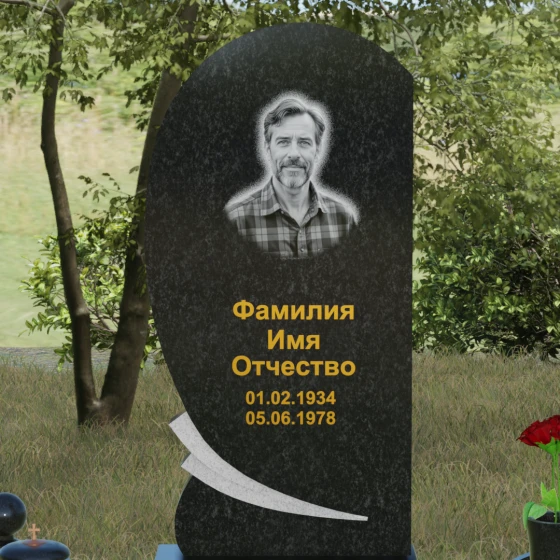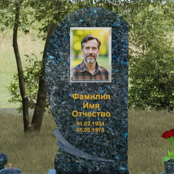 Оформление: Учитывая большую площадь полированной поверхности, данная форма идеально подходит для нанесения крупного портрета — как классической гравировки, так и фотокерамики в нише. Золоченая рубка букв, которую мы видим на примере, подчеркивает статусность мемориала и превосходно читается на темном фоне камня. Плавные линии стелы позволяют разместить эпитафию или дополнительные элементы оформления, такие как гравированные ветви березы или символические цветы, не перегружая композицию.