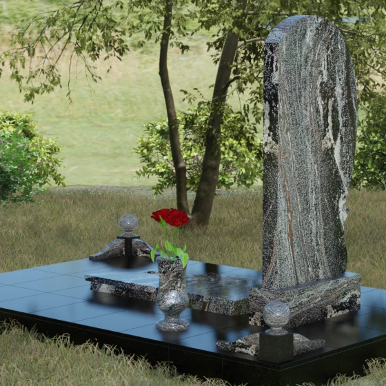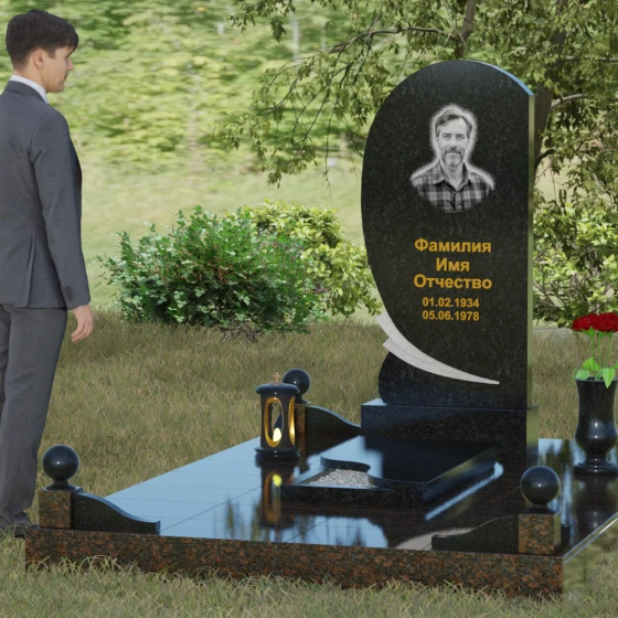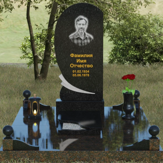Представленный мемориальный ансамбль (Артикул 080) — это не просто дань уважения, а подлинное произведение художественного камнерезания, в котором застыла тихая музыка прощания. Центральное место в композиции занимает величественная стела, чей силуэт напоминает развевающееся на ветру знамя или лепесток, устремленный ввысь. Асимметричная форма с плавным изгибом левой грани лишена резких углов, что придает монументу черты благородного модерна. Особое внимание привлекает декоративный элемент в основании стелы: изящная светлая вставка в виде закручивающейся ленты или волны. Этот резной акцент выполнен с ювелирной точностью и создает великолепный контраст с глубокой зеркальной полировкой основного массива камня.