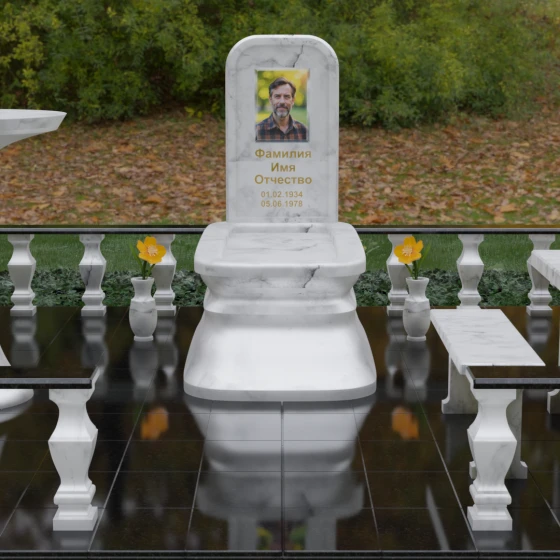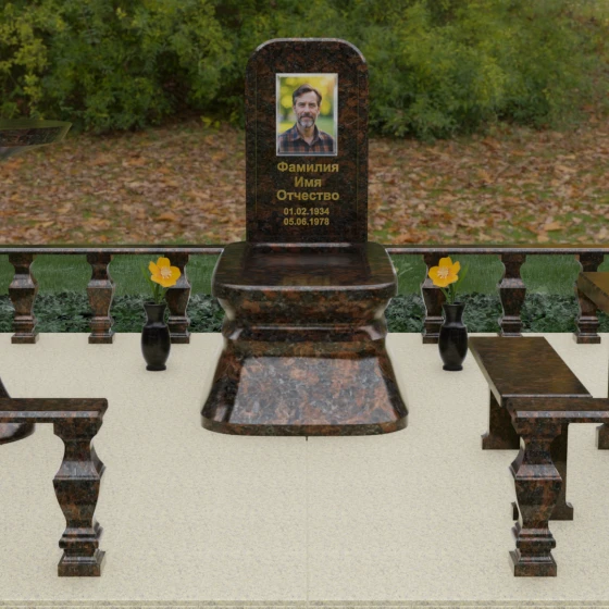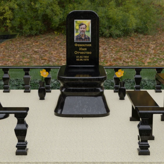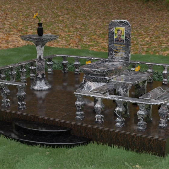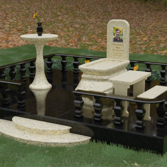 - Массивный гранитный стол и две скамьи на резных опорах, позволяющие близким в уединении провести время в воспоминаниях;