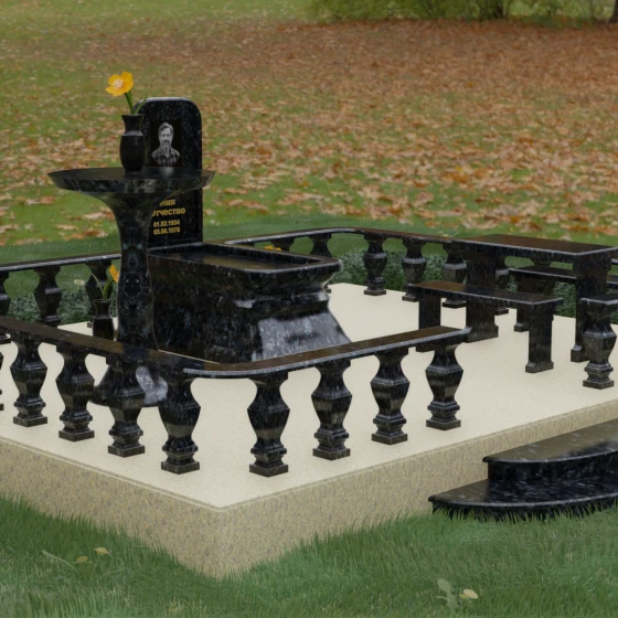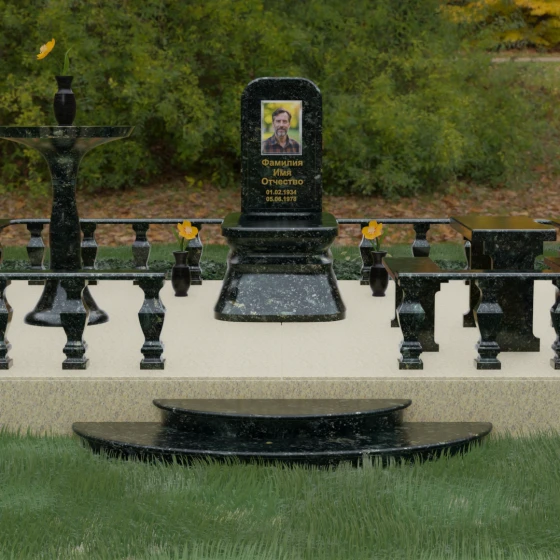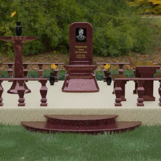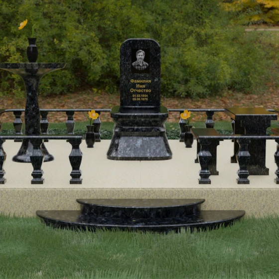 Форма данного надгробного сооружения наполнена глубокими смыслами. Высокая стела, устремленная вверх, символизирует путь души к свету, а её основательность и широкий постамент — незыблемость земной памяти. Закрытая территория, очерченная каменным ограждением, создает сакральное пространство, защищенное от суеты внешнего мира, обеспечивая покой и защиту. Каждая деталь — от фасок на гранях до плавных изгибов балясин — говорит о завершенности жизненного пути и вечности, в которой теперь пребывает ушедший.