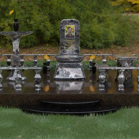 Центральным элементом ансамбля является вертикальная стела со строгой геометрией, вершина которой плавно скруглена, что смягчает монументальность образа и придает ему гармоничный вид. Особое внимание уделено многоуровневой подставке: массивное основание со сложной фрезеровкой и ступенчатыми переходами создает ощущение непоколебимой устойчивости и возвышенности. Фокус на игре света и тени на полированных гранях позволяет подчеркнуть безупречную зеркальность поверхности, где каждое преломление лучей создает эффект дополнительного объема и глубины камня.