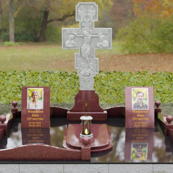 Данный мемориальный ансамбль представляет собой совершенный баланс между духовными традициями и современной архитектурной эстетикой. В центре композиции находится величественная стела в форме высокого православного креста, украшенного детальной многоуровневой резьбой. Барельефное изображение Распятия, выполненное с глубокой проработкой каждой детали — от складок плащаницы до ликов предстоящих, — создает ощущение покоя и благодати. Светлая, матовая фактура резного камня эффектно контрастирует с зеркально отполированными боковыми элементами, предназначенными для увековечивания памяти близких.