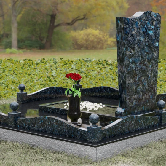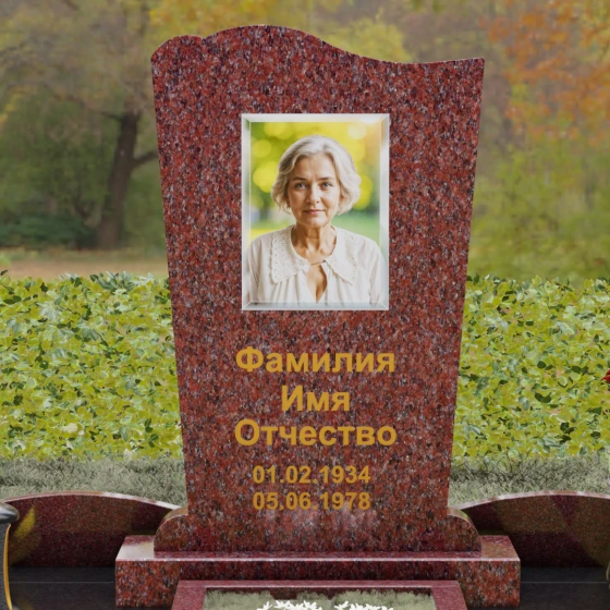 Стела этого ансамбля (Артикул 150) отличается изысканной асимметричной геометрией, которая выделяет её на фоне классических решений. Верхняя грань изделия выполнена в форме плавной, ниспадающей волны, напоминающей движение ткани или изгиб небесного свода. Этот мягкий рез по камню создает выразительный силуэт, который гармонирует с вертикальными боковыми гранями, слегка сужающимися к основанию. Особое внимание уделено фактуре: идеально гладкая зеркальная полировка лицевой поверхности контрастирует с четкими, мастерски обработанными фасками. Игра света на полированных гранях подчеркивает благородство природного материала, а глубина блеска создает эффект бесконечности, в которой отражается небо, соединяя земную память с вечностью.