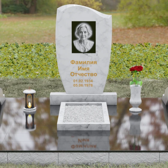 Геометрия модели сужается к основанию, что в сочетании с округлыми боковыми линиями создает силуэт, напоминающий древесный лист или раскрывающийся бутон. Это символизирует хрупкость жизни и одновременно крепость духа. Массивное основание обеспечивает визуальную устойчивость, плавно переходя в благоустроенный цветник. Наличие лаконичной каменной вазы и лампады, выполненных в едином стиле с основным массивом, завершает архитектурный облик участка, превращая его в целостный мемориальный комплекс. Использование белого декоративного гравия внутри цветника создает дополнительный цветовой акцент, подчеркивая чистоту и завершенность всей композиции.