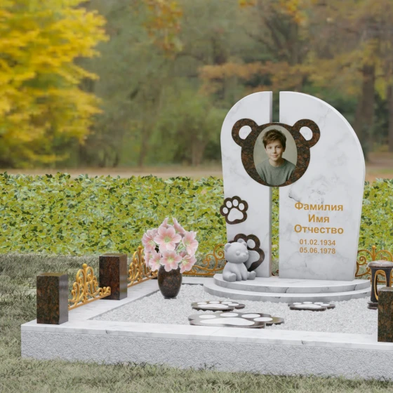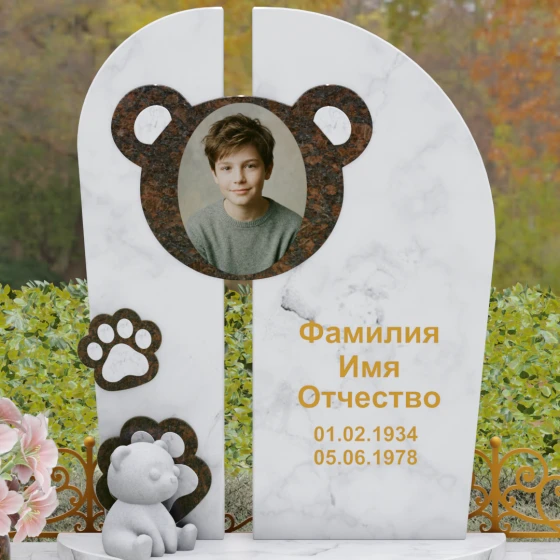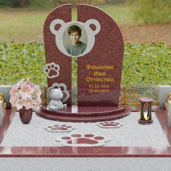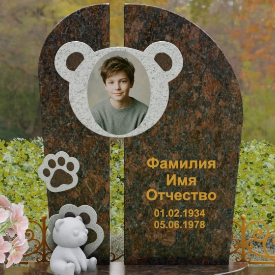 Композиция данного мемориала поражает своей уникальной архитектурой. Центральное вертикальное полотно разделено на две симметричные части узким вертикальным просветом, что создает ощущение легкости и устремленности ввысь, несмотря на внушительный вес камня. Главным художественным акцентом является медальон в верхней части, выполненный в виде стилизованной головы медвежонка. Портрет обрамлен светлой вставкой из благородного гранита, которая выступает над основной плоскостью, создавая эффект мягкого свечения вокруг лика.
