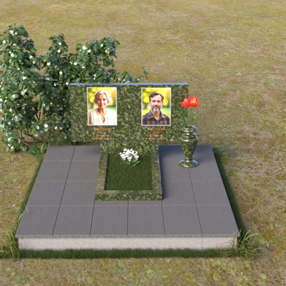 Представленный памятник (артикул ПГ001) являет собой образец строгости и лаконичности, где каждая деталь подчинена общей концепции увековечивания памяти. Композиция состоит из основания, облицованного серыми плитами, горизонтальной плиты, и вертикальной плиты с портретами. Дополнительно предусмотрена тумба для вазы.