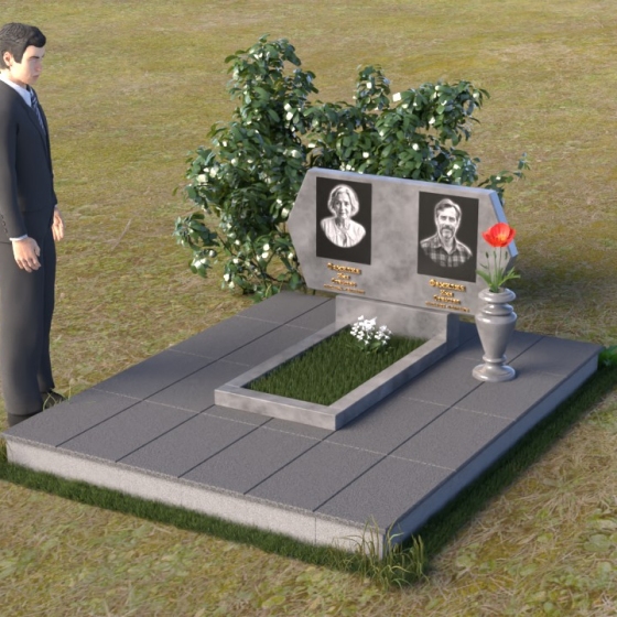 Величественная стела памятника ПГ004 представляет собой элегантное сочетание строгих линий и мягких, сглаженных углов. Верхняя часть имеет форму, близкую к прямоугольнику, но с деликатно скошенными верхними углами, что придает ей визуальную легкость и утонченность. Боковые грани плавно переходят в лицевую поверхность, создавая ощущение обтекаемости и завершенности. Фаска по периметру лицевой стороны подчеркивает четкость контура и добавляет дополнительный объем. Нижняя часть стелы, служащая основанием для размещения информации и портретов, выполнена в форме прямоугольной призмы, гармонично сочетающейся с основной частью памятника. Подставка под вазу выполнена в классическом стиле и имеет плавные обтекаемые формы.