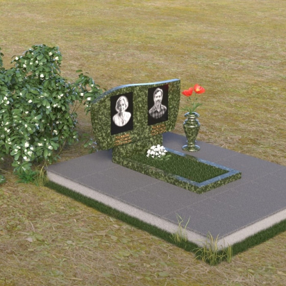 Этот памятник являет собой образец мастерства в обработке камня. Особое внимание привлекает игра контрастов: зеркально отполированный гранит, отражающий небо и окружающий мир, и деликатно выгравированные портреты усопших. Лаконичная ваза, выполненная в том же стиле, что и стела, гармонично дополняет композицию и служит местом для живых цветов, символизирующих вечную память и любовь.