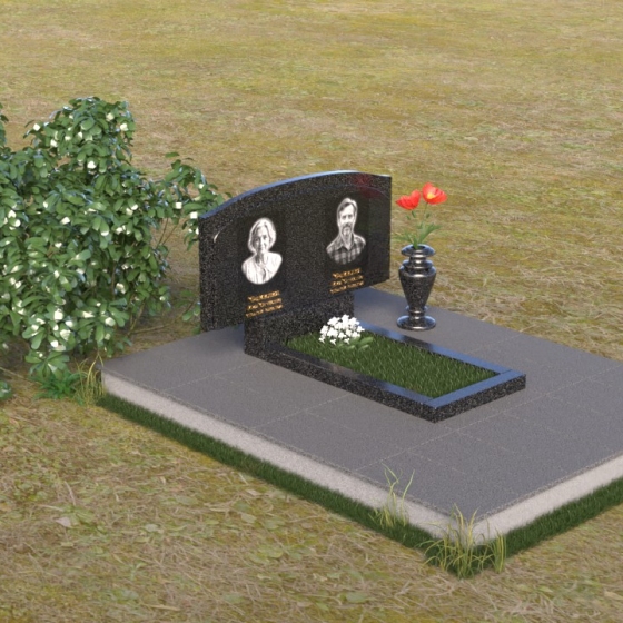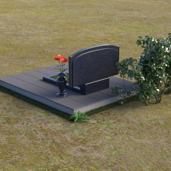 В нижней части стелы располагается прямоугольная вставка, также выполненная в полированном черном граните, что создает визуальный контраст и добавляет монументальности. Перед стелой установлена горизонтальная плита, повторяющая форму верхней части стелы, что придает композиции завершенность и гармонию. Рядом с памятником располагается ваза из черного гранита, в которой можно разместить живые цветы, символизирующие вечную память и любовь.
