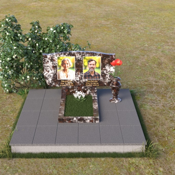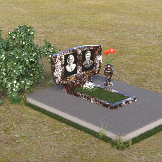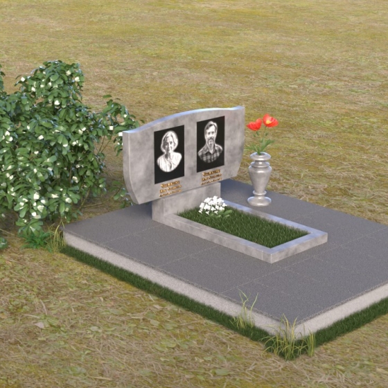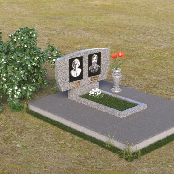 Оформление: Для данной формы надгробия рекомендуется использовать гравировку портретов в овальной или прямоугольной форме, расположенных симметрично относительно центральной оси. ФИО и даты жизни можно разместить под портретами, используя строгий и лаконичный шрифт. Также возможно нанесение эпитафии, выражающей скорбь и любовь близких.