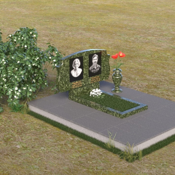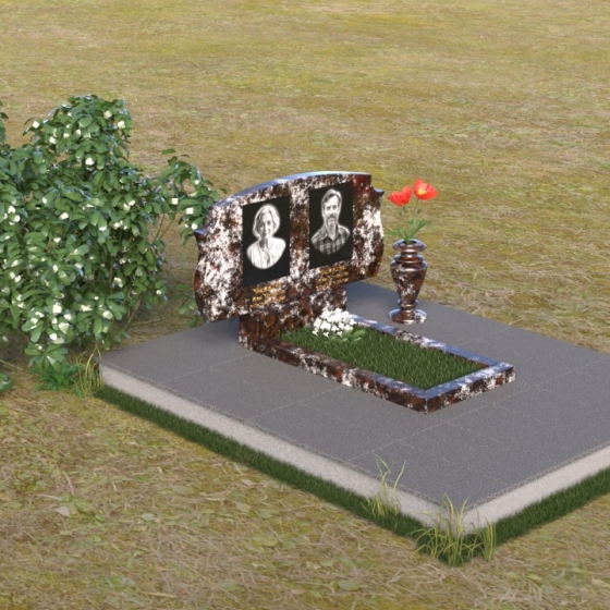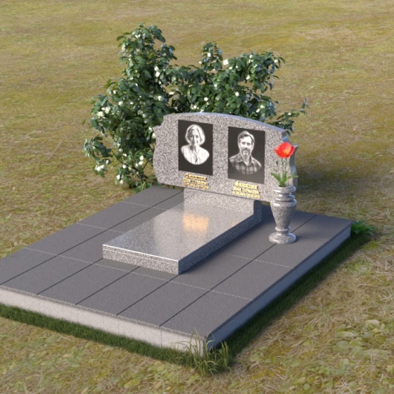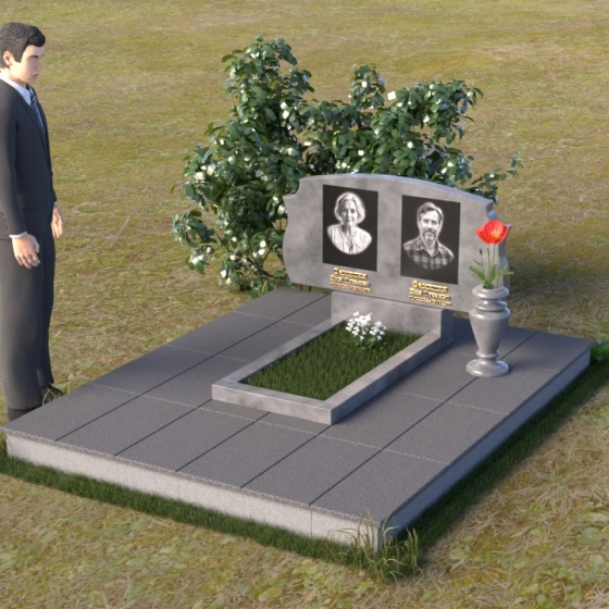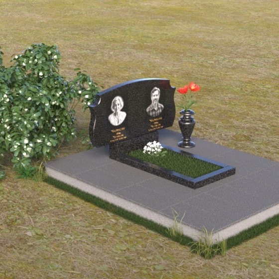 Этот памятник представляет собой вертикальную стелу, выполненную из полированного гранита. Форма стелы – это сочетание строгих прямых линий и плавных, скругленных изгибов. Верхняя часть памятника имеет волнообразный силуэт, создающий ощущение мягкости и умиротворения. Боковые грани стелы слегка скошены, что придает ей визуальную легкость и изящество. Лицевая поверхность тщательно отполирована до зеркального блеска, отражая свет и создавая эффект глубины. На полированной поверхности выгравированы портреты усопших, их имена, даты жизни, выполненные строгим шрифтом. Под портретами расположены небольшие прямоугольные ниши, которые могут быть использованы для размещения лампад или цветов. Нижняя часть памятника представляет собой горизонтальную плиту, также выполненную из полированного гранита. Плита служит основанием для стелы и обеспечивает ее устойчивость. Фаски по краям плиты смягчают ее строгую геометрию.