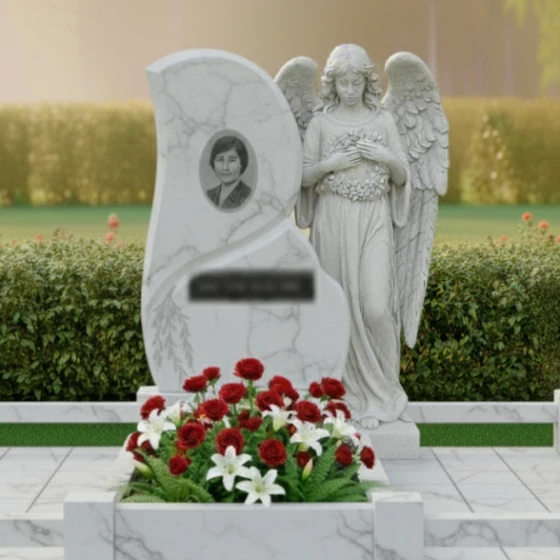 • Скульптура ангела: Ангел, выполненный из мрамора, с опущенной головой и сложенными руками, выражает глубокую скорбь и надежду на вечную жизнь.