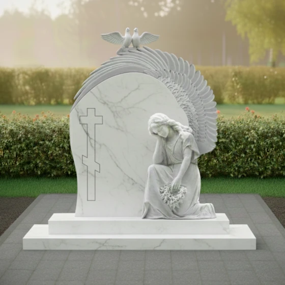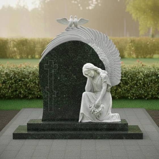 Гранитный монумент (Артикул: ПН 042) представляет собой глубокое художественное произведение, воплощающее вечную скорбь и светлую память. Его дизайн не просто отражает эстетику, но и погружает в мир символов, говорящих о любви, утрате и надежде. Центральный элемент композиции — это массивное вертикальное надгробие, выполненное в форме арки, словно обнимающей пространство памяти. Его левая грань обработана с идеальной полировкой, создающей зеркальную поверхность глубокого черного цвета, которая, словно бездонное зеркало, отражает мир, призывая к созерцанию. На этой полированной поверхности выгравирован лаконичный православный крест, чей строгий абрис с дополнительной нижней перекладиной, символизирующей подножие, и верхней короткой табличкой, выполнен в технике, которая позволяет ему слегка выступать над основной плоскостью, создавая эффект игры света и тени. Правая часть надгробия имеет плавный, волнообразный изгиб, переходящий в объемную резьбу, изображающую крыло. Каждое перо этого крыла вырезано с потрясающей детализацией, его матовая, светлая поверхность контрастирует с глубоким черным фоном, создавая ощущение легкости и невесомости. Эта игра контрастов — между блеском полированного гранита и матовой фактурой резьбы — придает монументу невероятный объем и глубину, заставляя его оживать под лучами света. Венчает композицию изящная скульптура, изображающая скорбящего ангела, преклонившего колени. Его фигура, выполненная из светлого камня, словно излучает внутренний свет, подчеркивая нежность и уязвимость. Голова ангела склонена, руки сложены на груди, в них он держит венок из цветов, каждый лепесток которых тщательно проработан, придавая венку реалистичный и трогательный вид. Над аркой, на ее вершине, расположены две белые голубки, символизирующие чистоту души и мир. Их фигуры выполнены в матовом светлом камне, что еще больше подчеркивает их символическое значение. Весь ансамбль покоится на двухступенчатом основании из черного полированного гранита, которое придает монументу устойчивость и завершенный вид. Контраст между матовыми элементами резьбы и блеском полированного камня создает удивительную игру света и тени, которая меняется в зависимости от освещения, придавая монументу динамичность и глубину. Это не просто памятник, это произведение искусства, которое говорит о вечных ценностях, о скорби и надежде, о памяти, которая живет в сердцах. Благоустройство участка выполнено с той же тщательностью и вниманием к деталям. Монумент установлен на массивный гранитный цоколь, придающий конструкции устойчивость и монументальность. Надгробная плита, выполненная в едином стиле со стелой, полностью покрывает пространство под памятником, создавая законченный и ухоженный вид, что значительно упрощает уход за местом захоронения. Отсутствие открытого грунта не только практично, но и эстетично, подчеркивая целостность композиции.