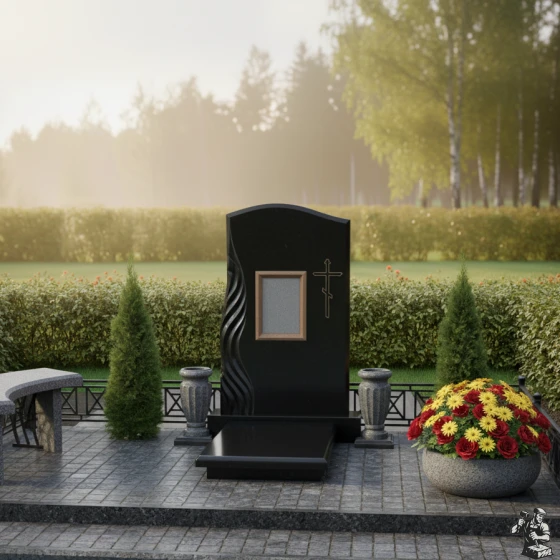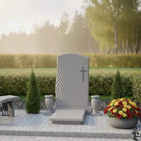 Перед вами не просто каменное изваяние, а благородная мемориальная композиция, исполненная с глубоким художественным смыслом и уважением к традициям. Этот монумент привлекает внимание своим гармоничным сочетанием строгой классики и современной пластики камня. Визуальной доминантой стелы является ее асимметричная форма: верхняя грань выполнена в виде плавной, мягкой волны, которая символизирует переход души в иной, лучший мир. Этот изгиб лишает конструкцию тяжеловесности, добавляя ей утонченности и воздушности.