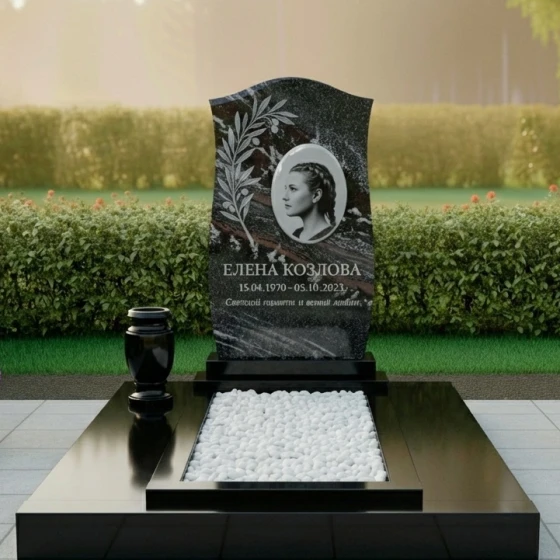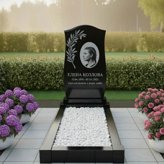 Центральный элемент композиции — величественный монолит, чья геометрия лишена банальности. Верхняя грань выполнена в форме плавной, асимметричной волны, напоминающей купол или небесный свод. Этот изгиб лишает конструкцию излишней жесткости, добавляя силуэту мягкости и лиризма. Левая сторона лицевой плоскости украшена искусной гравировкой в виде изящной ветви. Это может быть ветвь оливы, символизирующая мир и покой, или лавра, олицетворяющая вечную славу и победу жизни над забвением. Листья прорисованы с высокой детализацией: светлый матовый тон гравировки создает выразительный контраст с глубокой чернотой полированного поля, придавая изображению визуальный объем.
