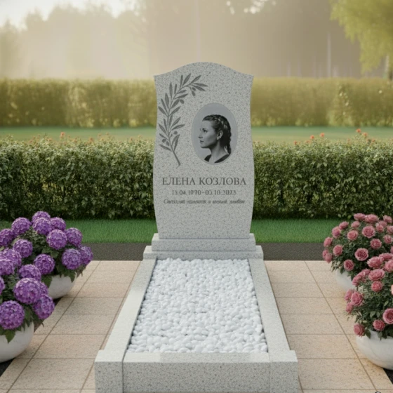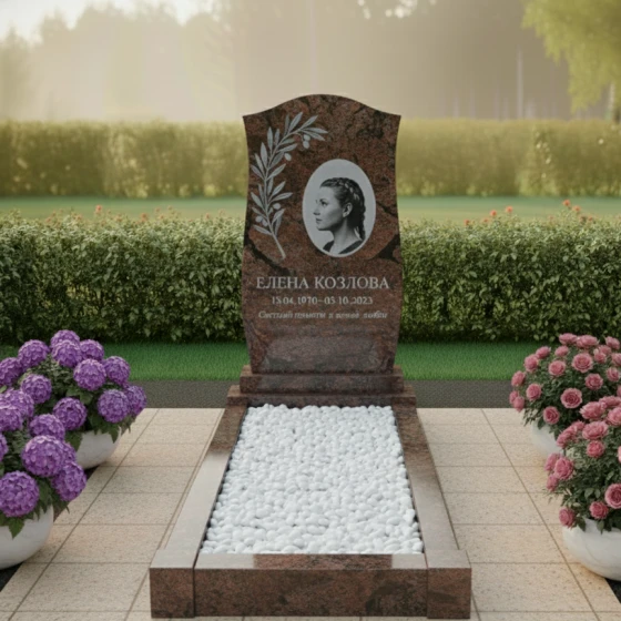 Кому подойдет: Данная модель обладает универсальной, но глубоко символичной эстетикой. Плавные линии навершия и растительный орнамент делают этот монумент идеальным выбором для увековечивания памяти женщины — матери, бабушки или супруги, подчеркивая её нежность и заботу при жизни. В то же время, монументальность гранита, строгость форм и лаконичность исполнения позволяют установить его на могиле мужчины, символизируя его твердый характер и благородство души. Это выбор тех, кто ищет баланс между строгой классикой и художественной выразительностью, желая создать на месте упокоения атмосферу светлой грусти и вечного покоя.