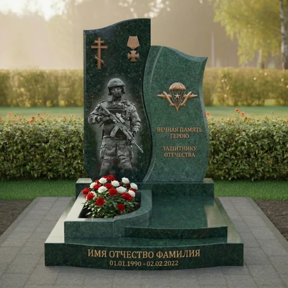 Правая стела, немного ниже и уже левой, имеет более динамичную, волнообразную форму. Ее верхняя часть плавно изгибается, создавая ощущение движения и легкости, несмотря на массивность камня. Лицевая сторона этой стелы также тщательно отполирована. В верхней части выгравирован символ Воздушно-десантных войск — парашют с крыльями, выполненный в золотистом цвете, что придает ему особую выразительность и значимость. Под ним располагаются проникновенные слова: "ВЕЧНАЯ ПАМЯТЬ ГЕРОЮ ЗАЩИТНИКУ ОТЕЧЕСТВА", выгравированные четким шрифтом, которые служат данью уважения и признательности. Боковые грани обеих стел имеют нежную, полуполированную обработку, которая мягко переходит в идеально отполированную лицевую часть, подчеркивая природную красоту камня и мастерство его обработки.