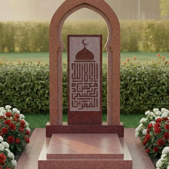 Представляем вашему вниманию модель памятника ПН 506 – это не просто надгробие из натурального камня, а истинное произведение искусства, призванное увековечить светлую память о близком человеке с глубоким почтением и достоинством. Каждая линия, каждый изгиб этого монумента пронизан смыслом и гармонией, создавая ощущение вечности и спокойствия. Центральная стела выполнена в форме изящной арки, напоминающей вход в священное место или портал в иной мир. Ее грани тщательно обработаны, создавая плавные переходы от полированных, зеркальных поверхностей к матовым, словно слегка припорошенным временем, срезам камня. Эта игра контрастов черного и серого гранита придает монументу невероятную глубину и объем, позволяя свету скользить по камню, подчеркивая его благородную текстуру. Внутри арки расположена прямоугольная вставка из светлого гранита, на которой выгравирована сложная каллиграфическая композиция, увенчанная полумесяцем и звездой – символами ислама. Эта гравировка выполнена с поразительной детализацией, где каждый элемент орнамента и каждая буква прорисованы с ювелирной точностью, создавая эффект кружевного узора, который кажется вырезанным из самого камня. Благодаря контрасту светлой гравировки на темном фоне, надпись читается легко и выразительно, притягивая взгляд и приглашая к размышлениям.