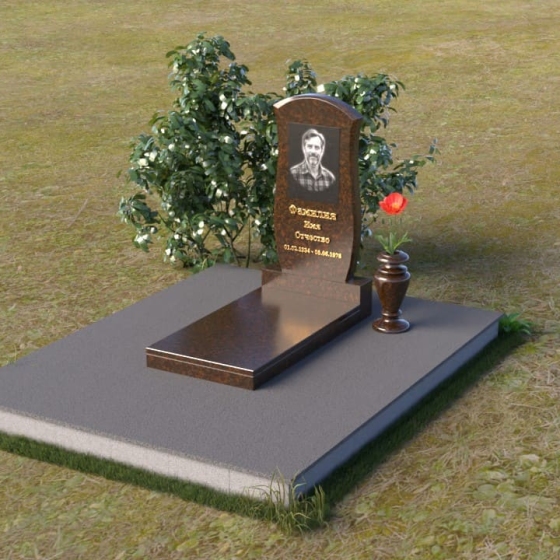 Данная модель предоставляет широкие возможности для индивидуального оформления. Портрет усопшего, выполненный методом гравировки, идеально вписывается в общую композицию, занимая центральное место на стеле. Золотистые буквы надписи, контрастируя с темным фоном полированного гранита, выглядят торжественно и выразительно. Мы рекомендуем выбирать фотографии высокого разрешения для достижения максимальной детализации и реалистичности портрета. Также возможно добавление дополнительных декоративных элементов, таких как эпитафии, религиозные символы или памятные даты. Небольшая подставка, выполненная в том же стиле, что и стела, гармонично дополняет композицию и может служить местом для возложения цветов. Элегантная ваза из черного гранита, расположенная рядом с надгробием, добавляет завершенность образу и позволяет сохранить свежесть цветов на длительное время.