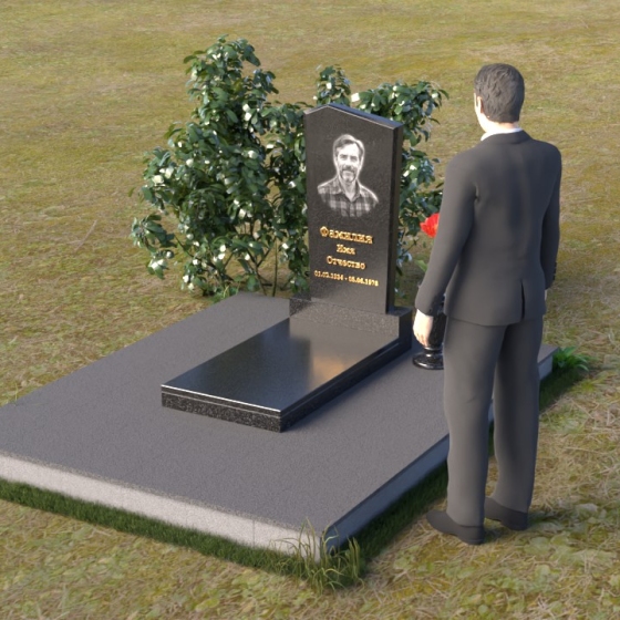 Этот гранитный монумент представляет собой композицию из двух основных элементов: вертикальной плиты с портретом и горизонтальной накладки. Вертикальная плита, возвышающаяся над землей, имеет строгую прямоугольную форму с небольшим скосом в верхней части. Это придает монументу сдержанную элегантность. Зеркальная полировка поверхности отражает свет, создавая ощущение глубины и сияния. На плите выгравирован портрет усопшего, выполненный с высокой точностью и вниманием к деталям. Ниже портрета располагается надпись с именем и датами жизни, выполненная золотым шрифтом. Горизонтальная накладка, расположенная в нижней части, также выполнена из черного полированного гранита и служит своеобразным пьедесталом для вертикальной плиты. Ее гладкая поверхность создает дополнительный контраст с окружающей средой. Рядом с монументом установлена ваза из черного гранита, предназначенная для живых цветов.