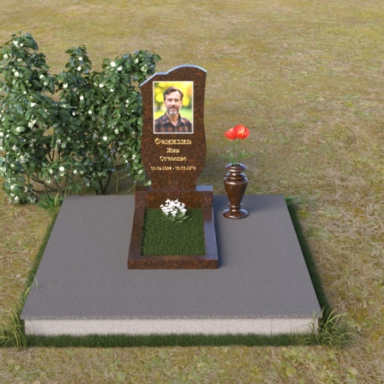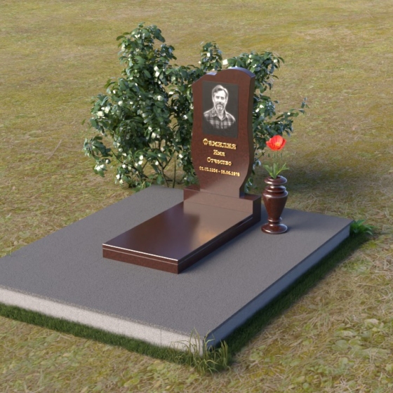 Основу композиции составляет вертикальная стела, выполненная из благородного камня. Её форма – это сочетание строгих линий и мягких, сглаженных углов. Верхняя часть стелы имеет плавный, слегка волнистый контур, который придает ей особую выразительность. Боковые грани стелы деликатно скруглены, что создает ощущение гармонии и завершенности. Фаска, обрамляющая верхнюю часть стелы, подчёркивает её лаконичную форму и добавляет объёмности.