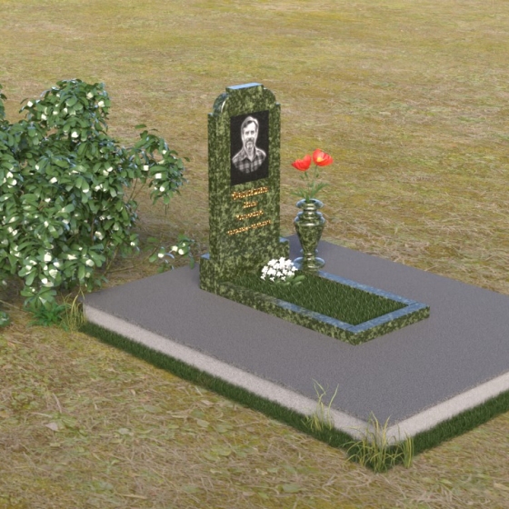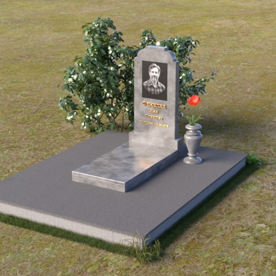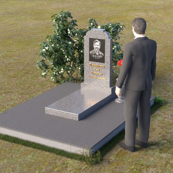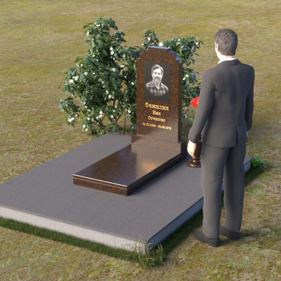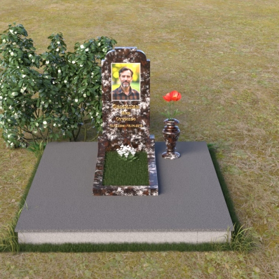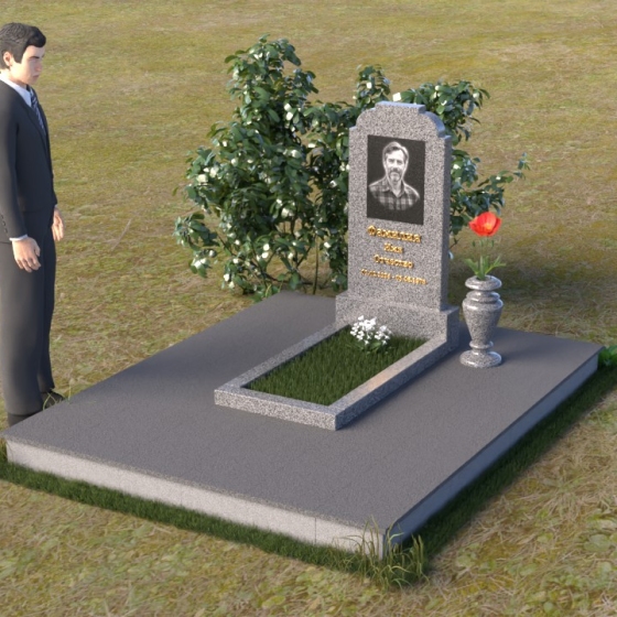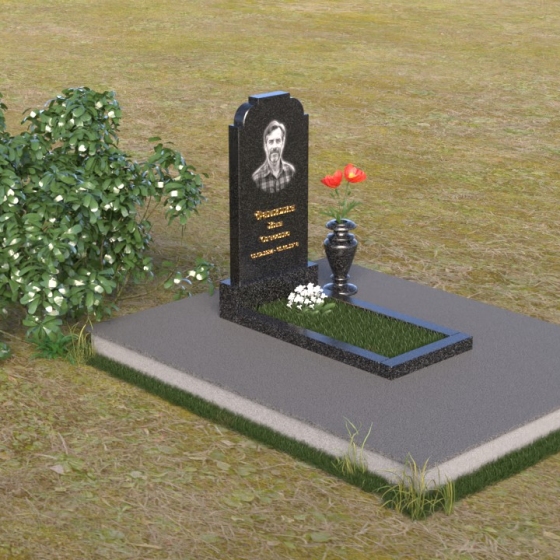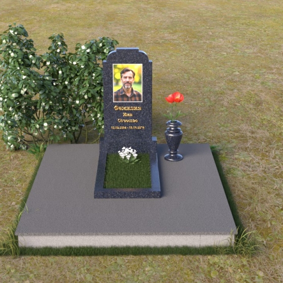 На лицевой стороне стелы располагается портрет усопшего, выполненный с высокой точностью и вниманием к деталям. Ниже выгравированы имя, отчество, фамилия и даты жизни, выполненные изящным шрифтом. Каждая буква, каждая цифра врезана в камень с любовью и уважением. Завершает композицию небольшая тумба, также выполненная из полированного гранита, на которую можно поставить цветы или свечи в память об ушедшем.