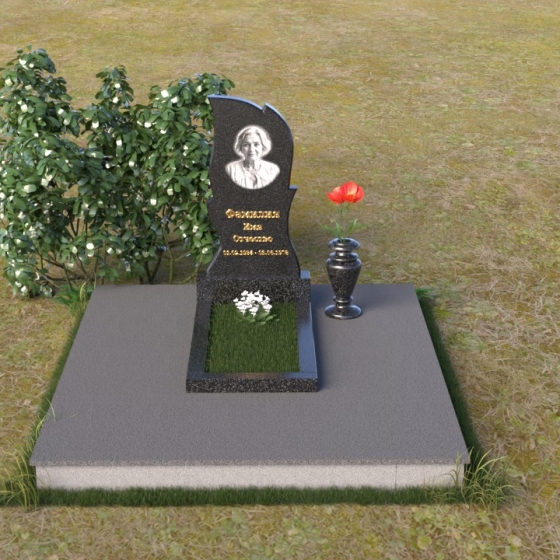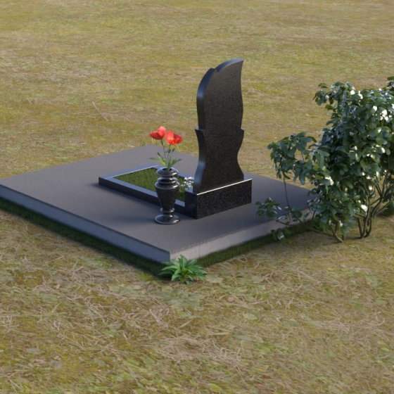 Ниже стелы располагается горизонтальная плита, выполненная из того же материала, что и стела. Она служит основанием для цветника и вазы. Поверхность плиты отполирована до зеркального блеска, создавая эффект глубины и отражения, словно напоминая о чистоте души ушедшего. Небольшая ваза из черного гранита завершает композицию, придавая ей завершенный вид.