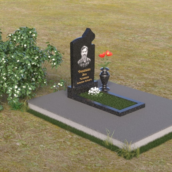 Этот мемориальный комплекс, включающий в себя величественную стелу, сочетает в себе строгость линий и глубину символизма, создавая достойный образ памяти. Взгляд сразу приковывает форма стелы – она будто сложена из двух частей: основная, устремленная вверх, и верхняя, с вырезанными элементами, напоминающими очертания пламени свечи или крыльев ангела. Обработка граней выполнена с особой тщательностью, создавая игру света и тени, подчеркивая благородство камня. Зеркальная полировка основной части стелы отражает окружающий мир, словно запечатлевая в себе моменты жизни, а матовая поверхность выгравированного портрета и надписи создает тактильный контраст, приглашая прикоснуться к истории.