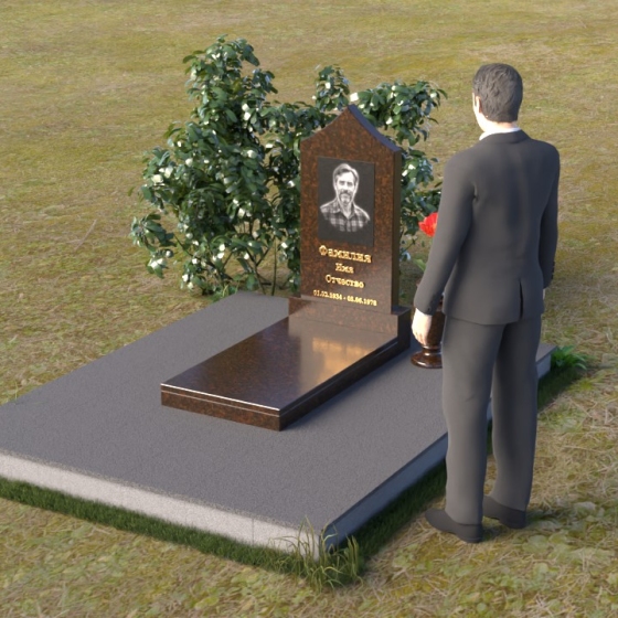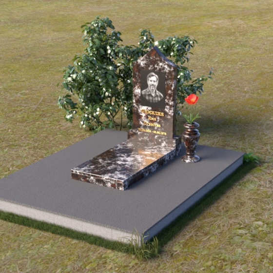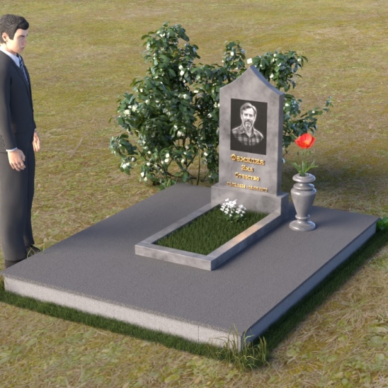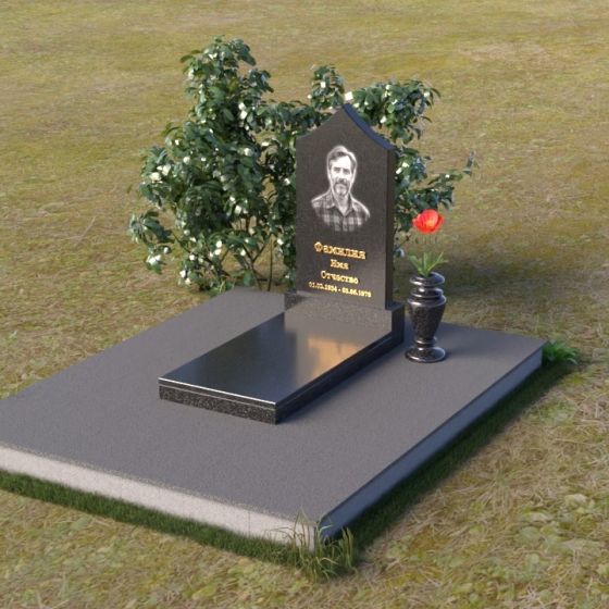 Начиная с основания, мы видим строгую прямоугольную форму, символизирующую незыблемость и надежность. Горизонтальная плита, установленная на небольшом возвышении, служит своеобразным пьедесталом для основного элемента композиции. Её зеркальная поверхность отражает небо и окружающий мир, создавая ощущение легкости и воздушности. Вертикальный элемент имеет форму, напоминающую арку с заостренным верхом, что придает ему устремленность ввысь, символизируя духовное восхождение. Верхняя часть обработана таким образом, чтобы создать небольшую площадку. На самом камне выгравирован портрет усопшего и памятная надпись, выполненная элегантным шрифтом.