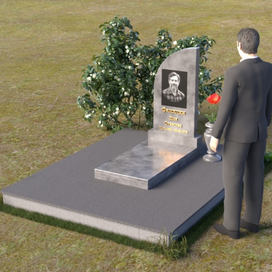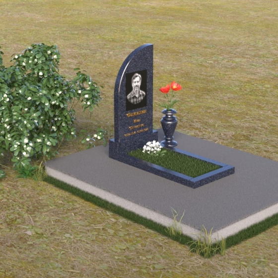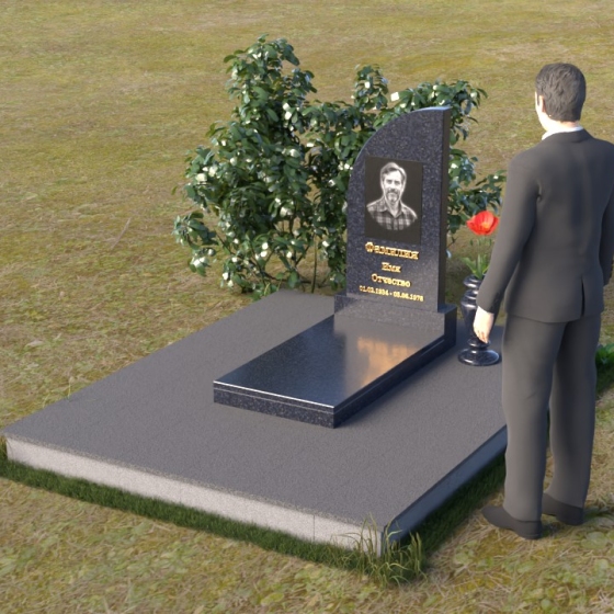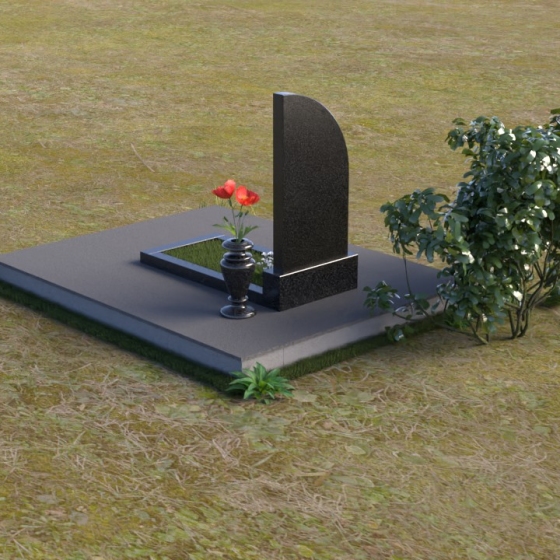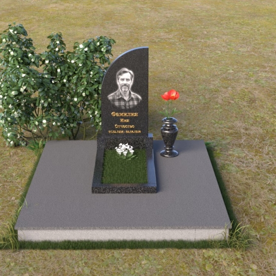 Стела имеет форму, близкую к прямоугольнику, но ее верхняя часть оформлена в виде плавной, скругленной волны. Этот изгиб смягчает строгость линий, привнося в образ нотки умиротворения и надежды. На полированной поверхности стелы выгравирован портрет, имя и даты жизни. Золотистые буквы словно светятся на фоне черного камня, привлекая внимание к важным деталям. Рядом со стелой располагается небольшая ваза из черного гранита, предназначенная для живых цветов, символизирующих вечную память и любовь. Лаконичная форма вазы не отвлекает внимание от основного образа, а лишь дополняет его.