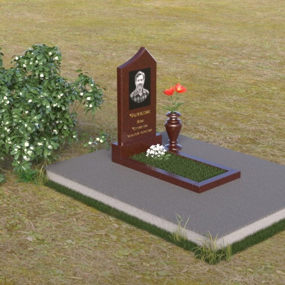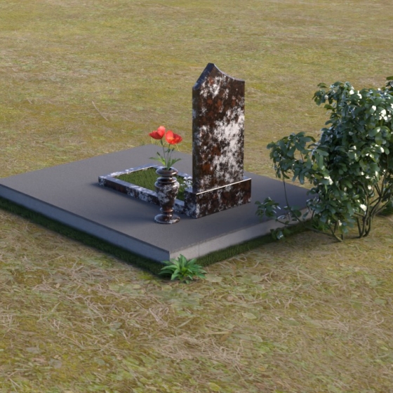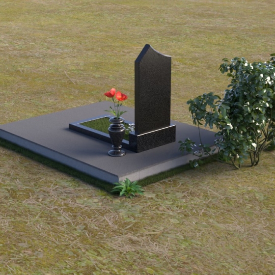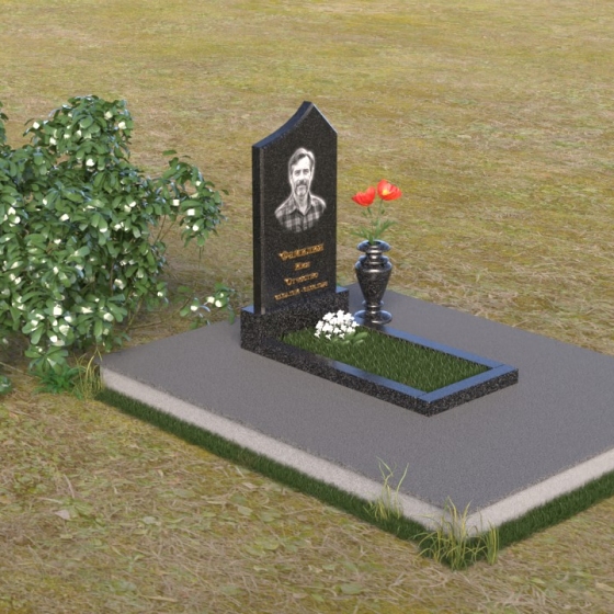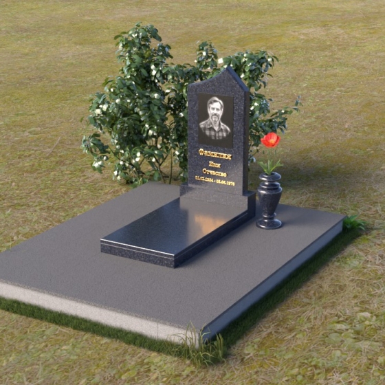 Основание памятника выполнено в виде массивной плиты, обеспечивающей устойчивость всей конструкции. На плите располагается горизонтальная надгробная плита, также выполненная из полированного черного гранита. Она служит местом для цветов, свечей и других памятных вещей. С правой стороны от стелы предусмотрено место для установки вазы. Ваза, выполненная в классическом стиле, гармонично дополняет общую композицию. Она имеет плавные, изогнутые линии и подчеркивает торжественность момента.
