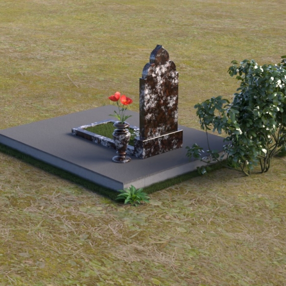 Основание композиции – прямоугольная плита с ровной, матовой поверхностью, обеспечивающая надежную устойчивость всей конструкции. На ней располагается горизонтальная плита, выполненная в виде усеченного параллелепипеда с зеркально отполированной поверхностью. Эта плита создает эффект глубины и отражает окружающий мир, словно запечатлевая моменты жизни ушедшего. Вертикальная стела возвышается над горизонтальной плитой, ее верхняя часть выполнена в форме изящной арки с плавными изгибами. Арка завершается небольшим декоративным элементом, напоминающим купол, что придает памятнику особую выразительность и духовность.