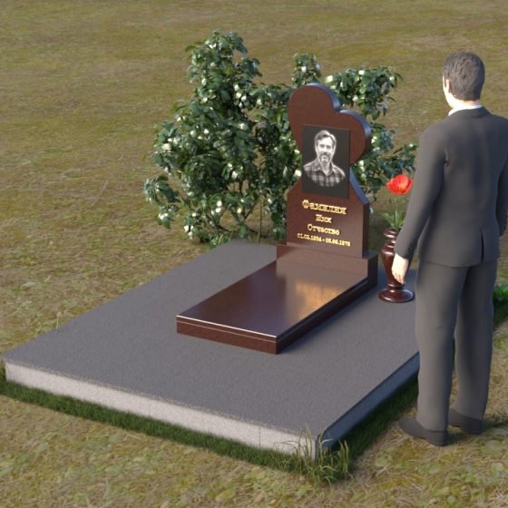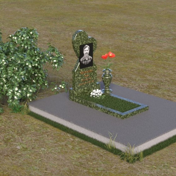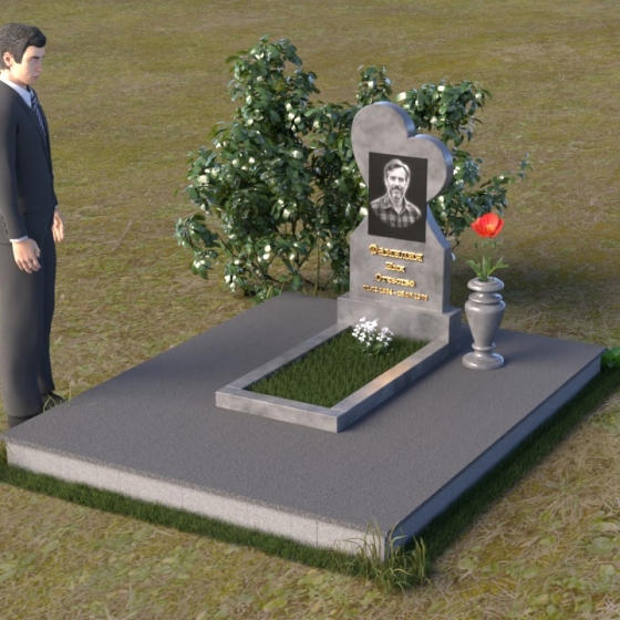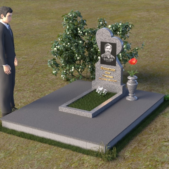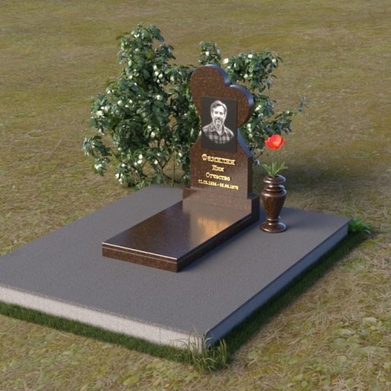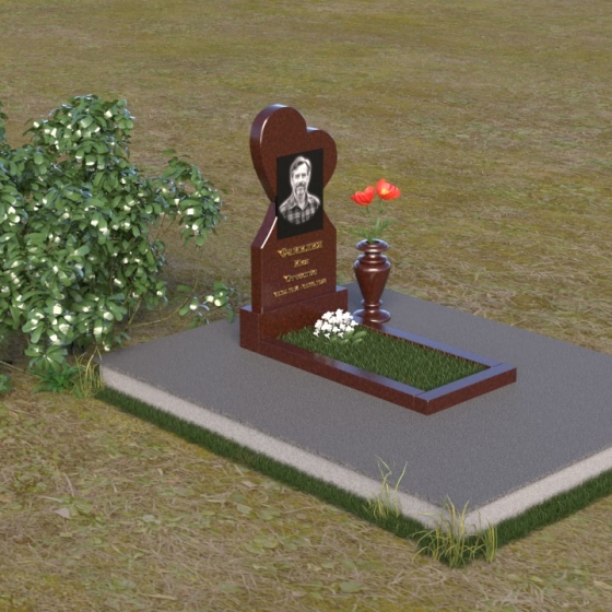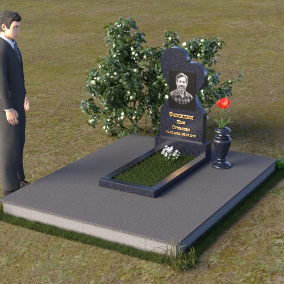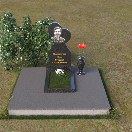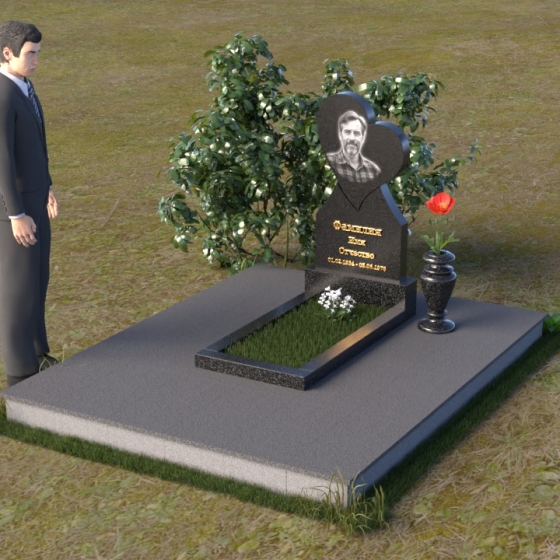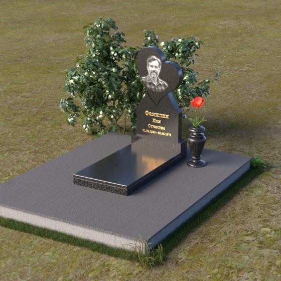 Этот памятник представляет собой изысканное сочетание строгих линий и плавных изгибов, создающее гармоничный и запоминающийся образ. Основная стела выполнена в форме сердца, что является традиционным символом любви и скорби. Верхняя часть сердца плавно переходит в более узкую часть, образуя своеобразный силуэт, устремленный ввысь. Грани стелы тщательно отполированы, что придает камню зеркальный блеск и подчеркивает его глубокий цвет. На лицевой стороне стелы располагается портрет усопшего, выполненный с высокой степенью детализации. Ниже портрета выгравированы имя, отчество и фамилия, а также даты рождения и смерти. Надписи выполнены изящным шрифтом, который придает памятнику благородный вид. Основание стелы выполнено в виде прямоугольной плиты, которая также тщательно отполирована. Плита служит надежной опорой для стелы и обеспечивает ее устойчивость. Фаски на плите аккуратно обработаны, что придает ей законченный вид.